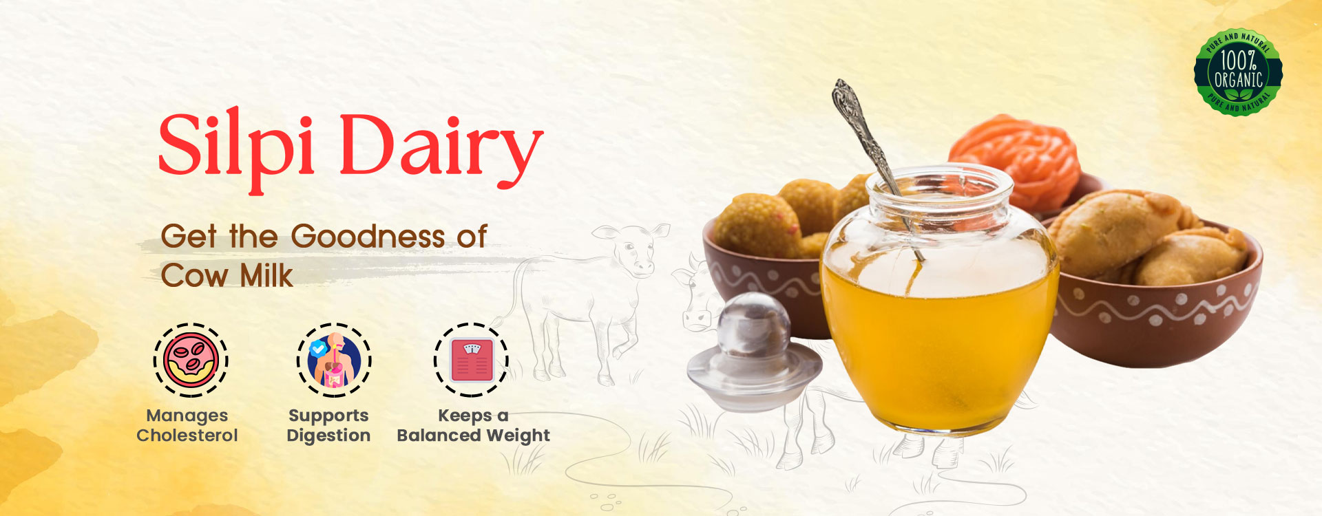 Production based on 100% pure cow milk ensures a high-quality nutritional value and meets consumers' demands. It is the essence that brings the wow factor to all our products. Silpi Ghee has an excellent shelf life and exceptional flavour that help us acquire a distinct place in your kitchen. We are acclaimed for offering and maintaining high-quality in our products and packaging.